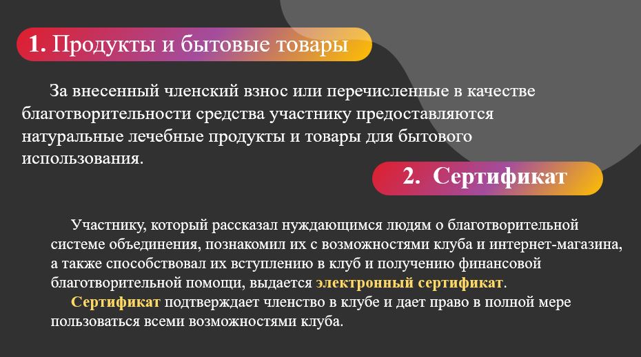Член клуба получает в знак благотворительности подарок — натуральные продукты или товары для дома. Кроме того, по просьбе членов клуба в подарок предоставляется стартовый курс очищения организма на основе натуральных лечебных средств, способствующий укреплению здоровья и профилактике заболеваний.