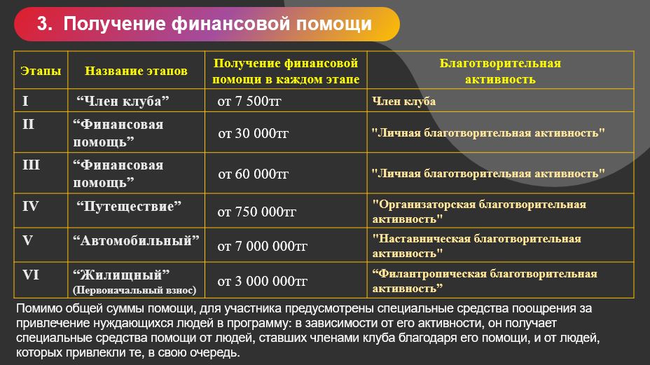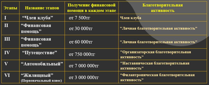 | II | “Финансовая поддежка” | от 30 000 тг | “Личная благотворительная активность” |