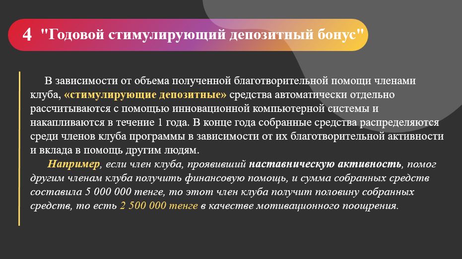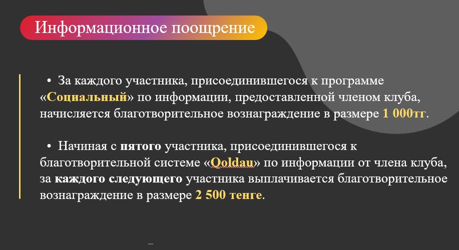 • Для каждого участника из благотворительных средств клуба выделяется 11 900 тенге , чтобы он мог стать членом клуба и получить возможность получать финансовую помощь через благотворительную систему «Qoldau».