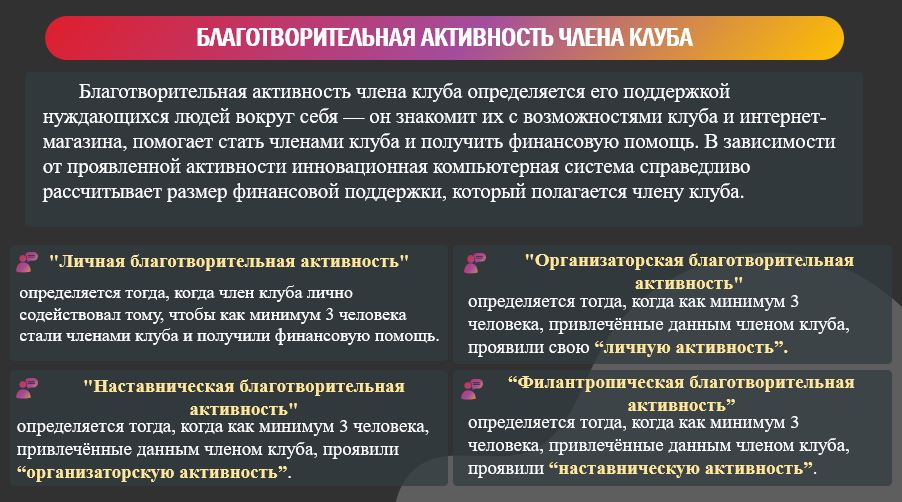 Благотворительная активность члена клуба определяется тем, насколько он знакомит нуждающихся людей из своего окружения с возможностями клуба и интернет-магазина, а также помогает им стать членами клуба и получить финансовую помощь. В зависимости от показанной активности, с помощью инновационных алгоритмических расчетов определяется размер финансовой помощи, которую получает член клуба.