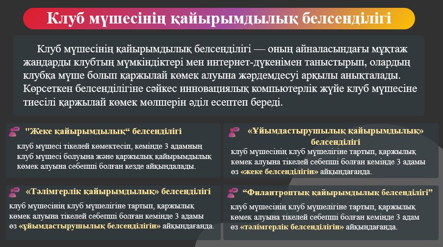 Клуб мүшесінің қайырымдылық белсенділігі - оның өз маңайындағы көмекке мұқтаж адамдарды клубтың мүмкіндіктері мен интернет-дүкенімен таныстыруына және олардың клубқа мүше болып, қаржылық көмек алуына көмектесуіне байланысты анықталады. Көрсеткен белсенділігіне сәйкес, инновациялық алгоритмдік есептеулер арқылы клуб мүшесінің алатын қаржылық көмек мөлшері анықталады.