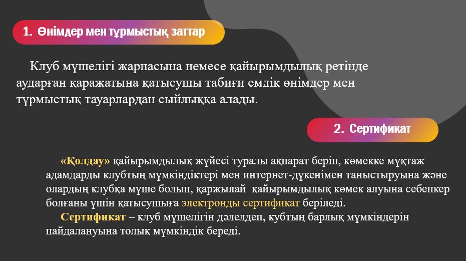 "Қолдау" бағдарламасы – өз денсаулығын күтіп, рухани дамып, табыс табуға, көмек алуға және жақсылық жасауға ұмтылатын клуб мүшелеріне арналған платформа.