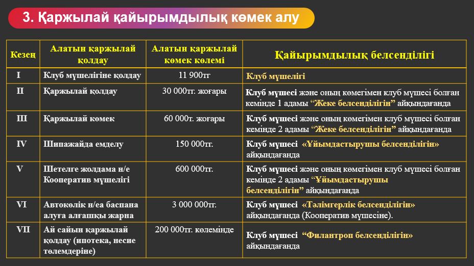 | VII | Ай сайын қаржылай қолдау | айына 200 000 тг. көлемінде | Клуб мүшесі және оның көмегімен клуб мүшесі болған кемінде 2 адамы “Филантроп белсенділігін” айқындағанда (Кооператив мүшесіне). |
