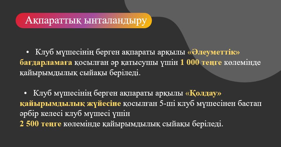 • Әр қатысушыға клубтың қайырымдылық қаражатынан 11 900 теңге бөлініп, ол осы қаражат арқылы клуб мүшелігіне өтіп, «Қолдау» қайырымдылық жүйесі арқылы қаржылық көмек алу мүмкіндігіне ие болады.