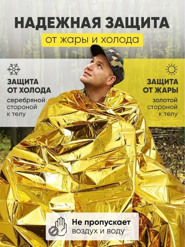 - Защита от переохлаждения, серебристой стороной к телу (сохраняет тепло до 20 часов);