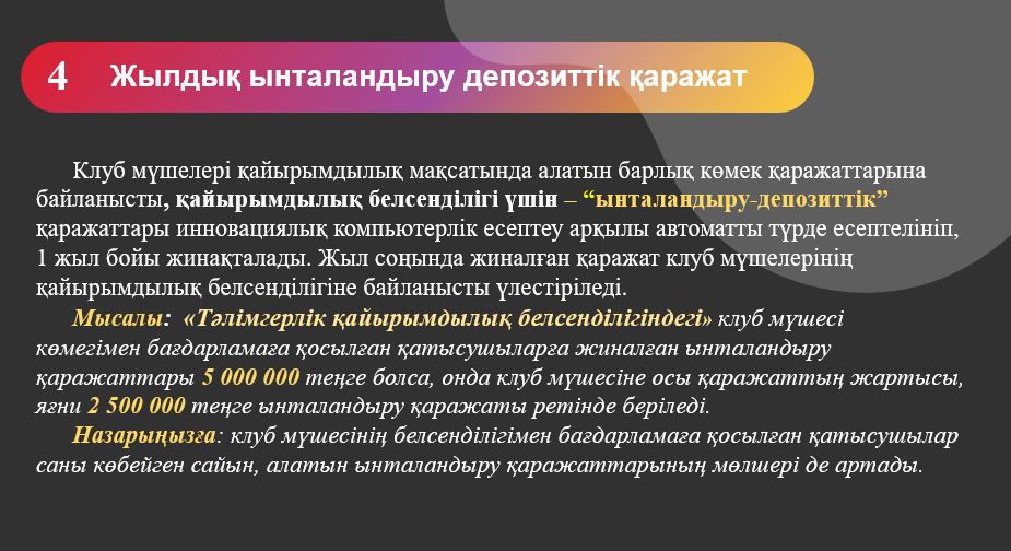 - Клуб жөнінде ақпарат таратып, бағдарламаға қатыстырған әр адамды үшін — 1 000 теңге қайырымдылық сыйақы беріледі.