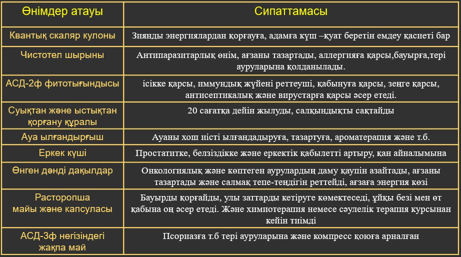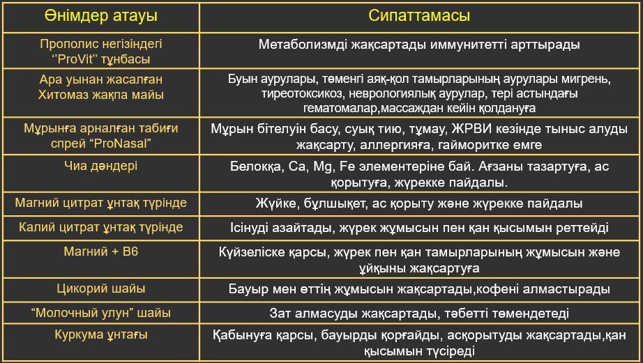 - "ProVit" денсаулық эликсирі - суық тию мен тұмауға қарсы табиғи құрал.ЛОР-ауруларында, ауыз қуысы мен қызыл иек қабынуларында тиімді.