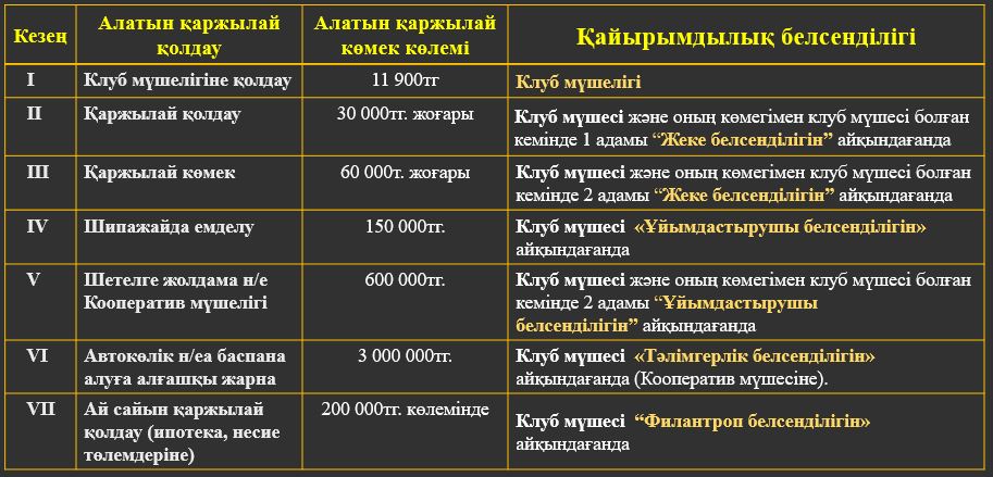 VII | Ай сайын қаржылай қолдау | айына 200 000 тг. көлемінде | Клуб мүшесі және оның көмегімен клуб мүшесі болған кемінде 2 адамы “Филантроп белсенділігін” айқындағанда (Кооператив мүшесіне). |